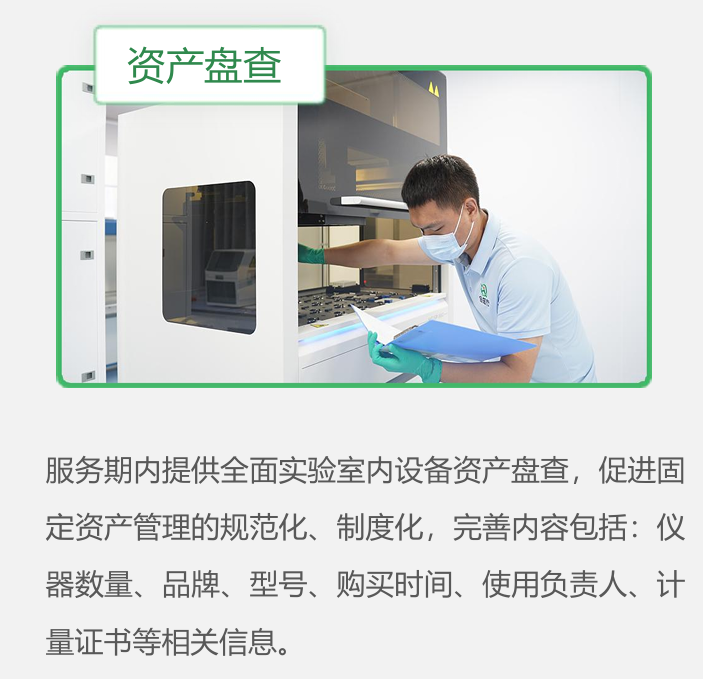 服务期内提供全面实验室内设备资产盘查, 促进固定资产管理的规范化、制度化, 完善内容包括:仪器数量、品牌、型号、购买时间、使用负责人、计量证书等相关信息。